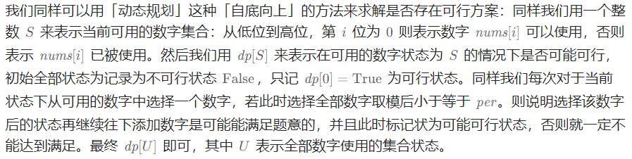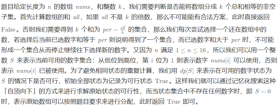 // dp[S]: 数组可用状态为i时,是否可以划分为k个相等的子集