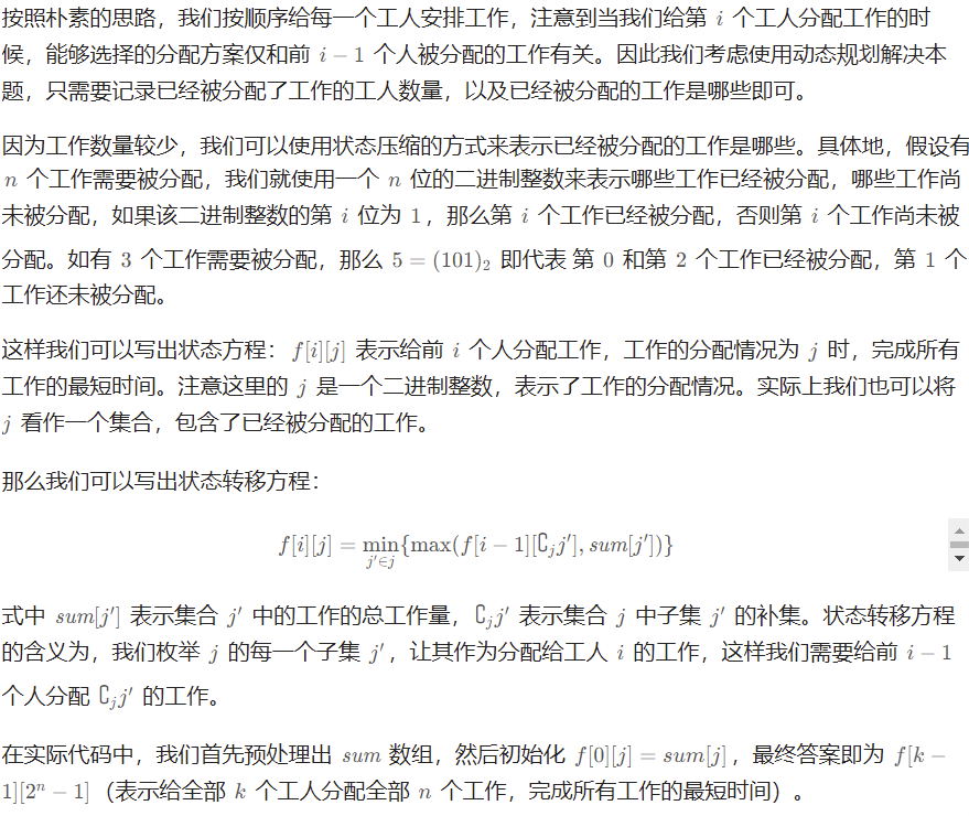 // dp[i][j]: 安排i+1个工人,工作安排为j情况下,需要的最短时间