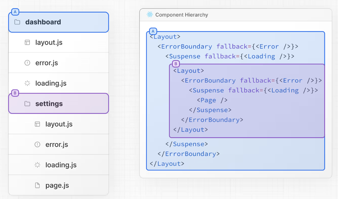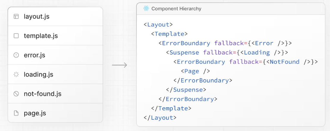 layout.jstemplate.jserror.js(React error boundary)loading.js(React suspense boundary)not-found.js(React error boundary)page.js或嵌套的layout.js
