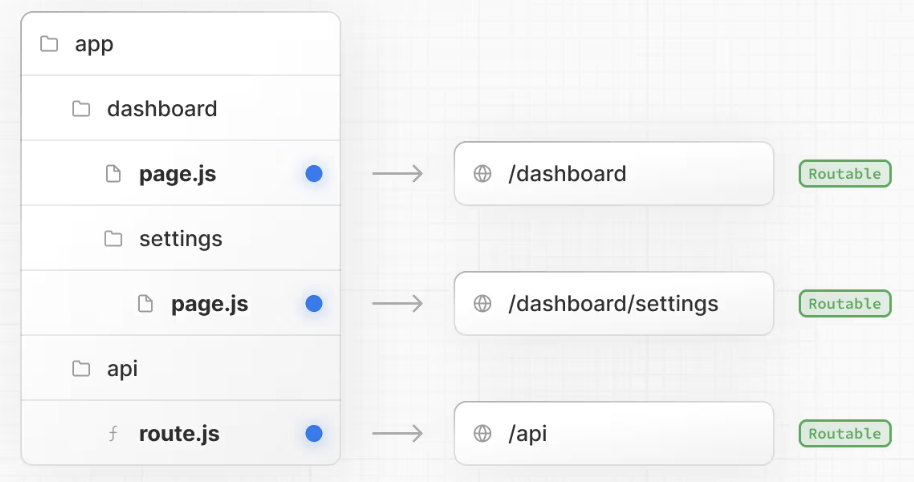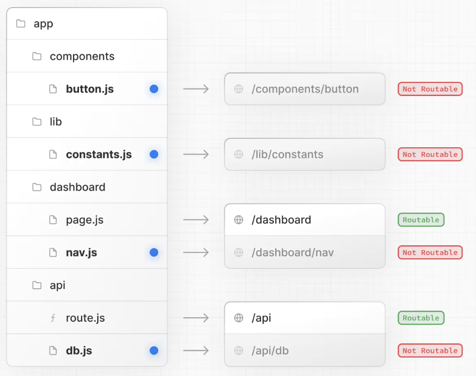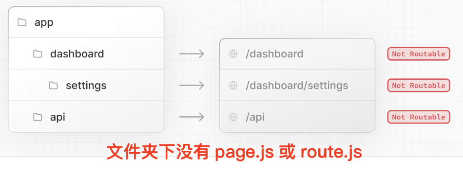 但是,即使通过文件夹定义路由结构,在将 page.js 或 route.js 文件添加到路由段之前,路由也是不可公开访问的