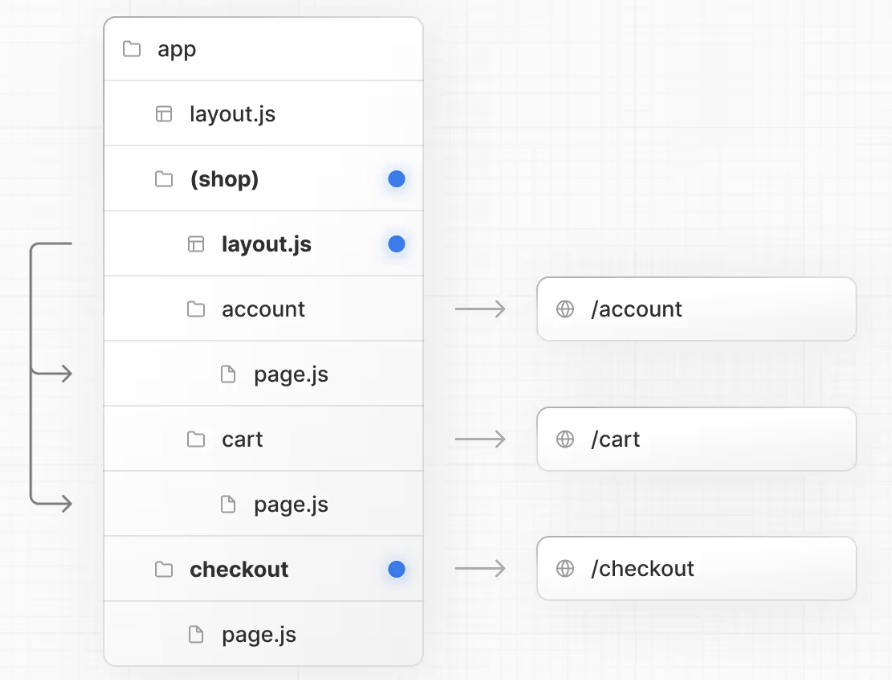 要将特定路由页面使用不同的布局,请创建一个新的路线组(例如 (shop)),并将共享相同布局的路由(例如 account 和 cart)移入该组。组外的路由将不会使用布局(例如 checkout)