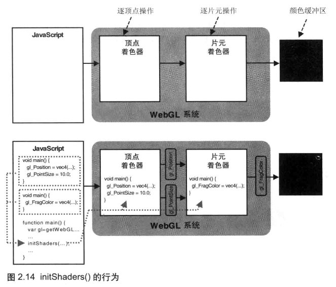 initShaders:在 WebGL 系统内部建立和初始化着色器- 抽象的函数,真实环境并不存在,可以看成一个黑盒,现阶段无需知道其内部实现细节