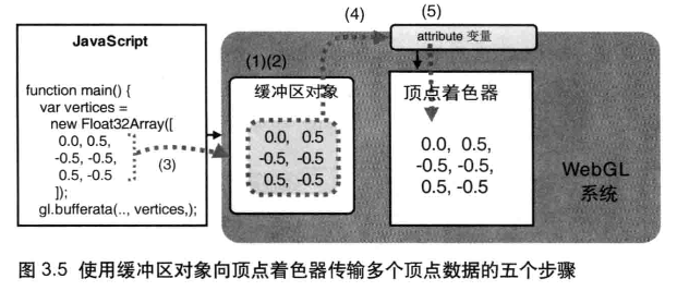 使用缓冲区对象向顶点着色器传入多个顶点的数据,需要遵循以下 5 个步骤: