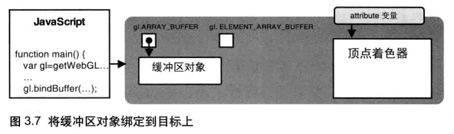 将缓冲区对象绑定到 WebGL 系统中已经存在的“目标”, 这个“目标”表示缓冲区对象的用途(这里是向顶点着色器提供传给 attribute 变量的数据),这样 WebGL 才能正确处理其中的内容