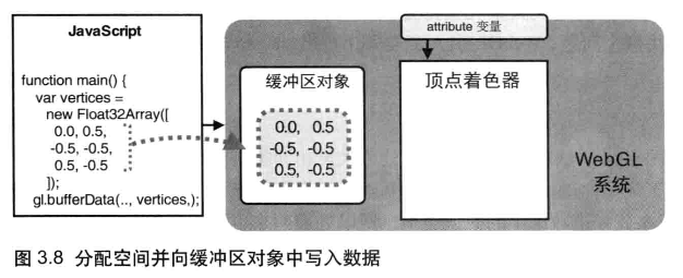 之前,可以使用 gl.vertexAttrib[1234]f() 系列函数为 attribute 变量分配值。但是,这些方法一次只能向 attribute 变量分配(传输)一个值。而现在,需要将整个数组中的所有值一次性地分配给一个 attribute 变量