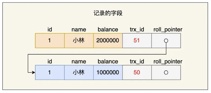 trx_id:当一个事务对某条聚簇索引记录进行改动时,就会==把该事务的事务 id 记录在trx_id隐藏列里==roll_pointer:每次对某条聚簇索引记录进行改动时,都会把旧版本的记录写入到 undo 日志中,然后这个隐藏列是个指针,指向每一个旧版本记录