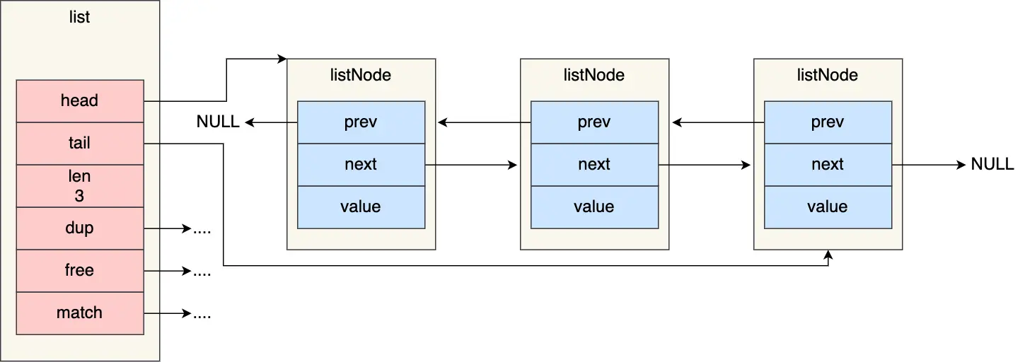 } list;list 结构为链表提供了链表头指针 head、链表尾节点 tail、链表节点数量 len、以及可以自定义实现的 dup、free、match 函数