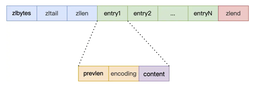 prevlen:「前一个节点」的长度,目的是为了实现从后向前遍历encoding:当前节点数据的「类型和长度」,类型主要有两种:字符串和整数content:当前节点的实际数据