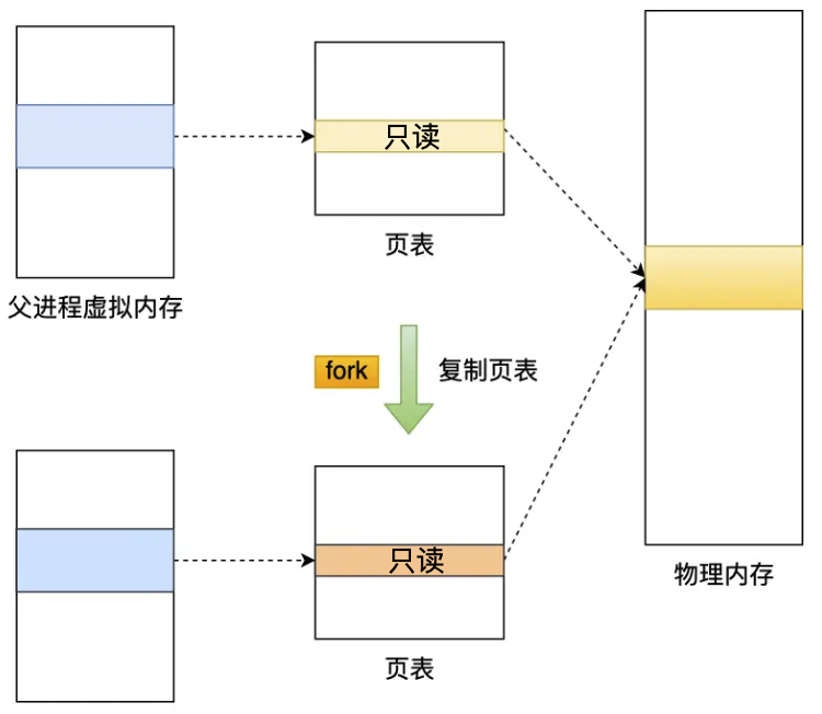 这样一来,子进程就共享了父进程的物理内存数据,页表对应的页表项属性会标记该物理内存的权限为只读