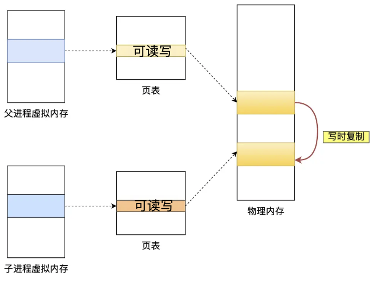 当父进程或子进程在向这个内存发起写操作时,CPU 就会触发写保护中断,操作系统会在「写保护中断处理函数」里进行物理内存的复制,并重新设置其内存映射关系,将父子进程的内存读写权限设置为可读写,最后才会对内存进行写操作,这个过程被称为「写时复制(Copy On Write)」