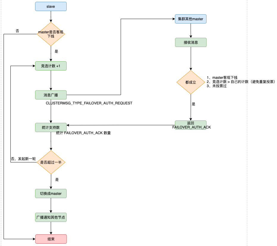 - 新的主节点会撤销所有对已下线主节点的 slots 指派,并全部指派给自己
